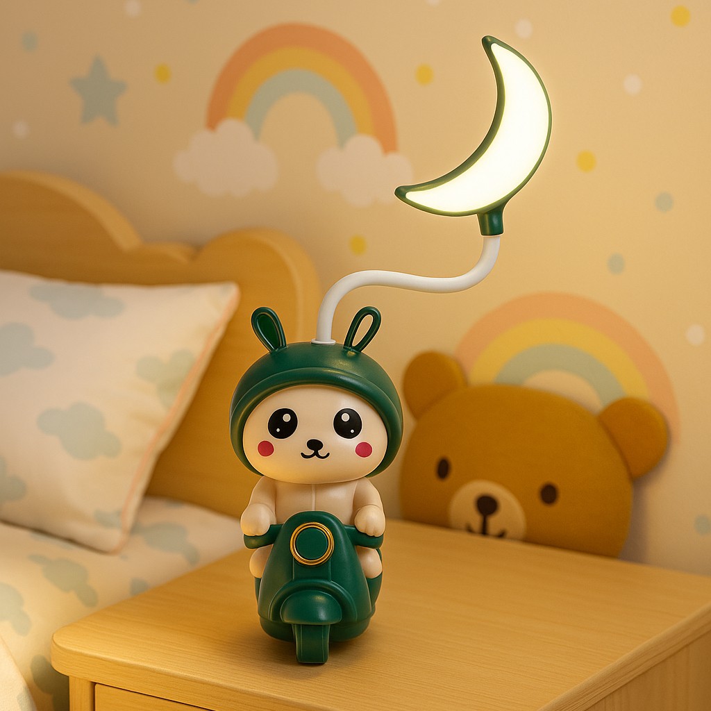 Cute Scooter LED Night Lamp for Kids | Moon Light with Flexible Neck | Rechargeable USB Desk Lamp for Study & Decor | Bunny Rider Design – Green
