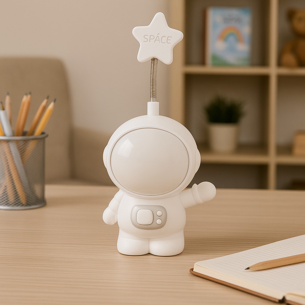 Make study time or bedtime extra special with this Astronaut Desk Lamp for Kids! Designed with a cute and creative space theme, this multifunctional lamp lights up the room with adjustable multicolor lighting to suit different moods—whether it’s time to focus or wind down. USB rechargeable, it’s perfect for use at home or on the go without the need for batteries. It also features a pencil holder to keep your child’s desk tidy and a built-in sharpener for added functionality. This all-in-one lamp is both fun and practical, making it an ideal companion for your child’s study table, bedside, or even as a decorative piece in a space-themed room.